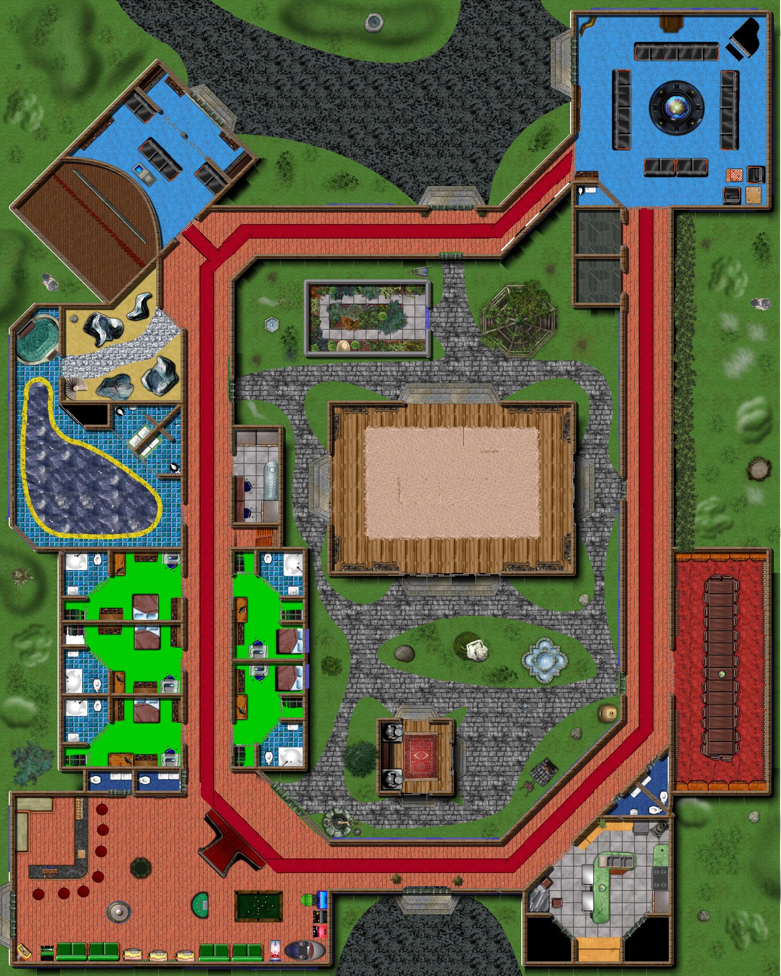 The building completely surrounds a large courtyard containing a dojo, a small greenhouse and a shrine. The dojo walls are covered in weapon racks with at least 2 of every melee weapon imaginable, 1 combat quality version, and a wooden version for sparring.