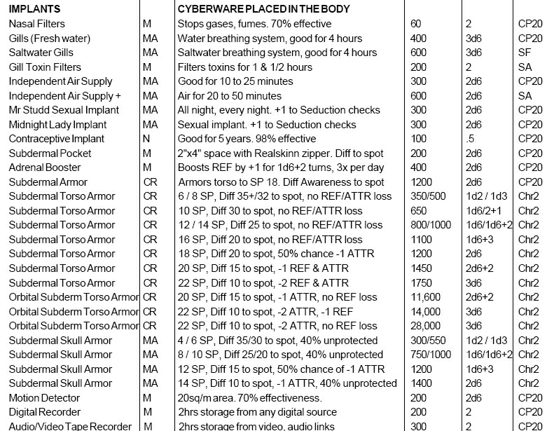 standard Cybernetic body options and artificial organ replacements.