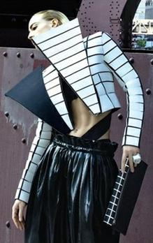 (The shroud is made from a very strong, but very thin material, it clings naturally to the body, but weighs enough to drape, the properties of the material give a certain “shrink wrapped” look to the wearer. It also acts as a flexible 2 way mirror, while still allowing air to move through as easily as it would cotton.)