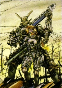 "KNOWLEDGE WAS LOST. CONFUSION REIGNED. NEW POWERS ROSE TO DISPLACE THE OLD NATIONS." "NUCLEAR WEAPONS THEMSELVES WERE NEVER USED. BUT EVEN WITHOUT THEM THE EARTH BECAME A QUIETER PLANET." "THE WAR ENDED AND NO ONE CAME OUT ON TOP. BUT OUT OF THE RUINS ONE CITY SURVIVED - OLYMPUS, A "UTOPIAN CITY RUN BY PERFECT PEOPLE." OUT OF OLYMPUS THE CENTRAL MANAGEMENT BUREAU (CMB) ALSO KNOWN AS "AEGIS," UNIFIED THE WORLD, ENFORCING THE IDEALS OF TOTAL DIARMAMENT, TRADE, AND ECONOMIC STABILITY." -Introduction to Appleseed, Masamune Shirow |