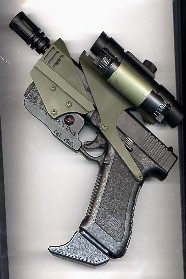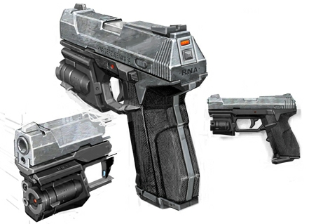 | MILITECH RNA-12- Militechs latest handgun, they are hoping to win both the Standard and Special Forces Military Sidearm competitions for the United States Armed Forces with this one, it fires 12mm rounds, has an integral laser sight, and accepts a suppressor. |