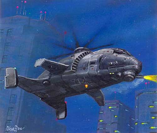 SPECIAL EQUIPMENT: comes standard with military radio W/scrambler, satellite uplink, full visual suite, damage control, Fire extinguisher, auto-pilot, navigation systems, cybernetic linkage, military radar with terrain following, radar detector, laser communicator,chaff and flaredispensers, ECM, ECCM, capable of amphibious landing, high powered directional microphone and motion sensors, belly monted spotlight, and camera (with IR, Thermograph, Image enhancement, and telscopic lense), (corporate version has wall to wall carpeting and upholstery, a full entertainment suite, and a wet bar.)