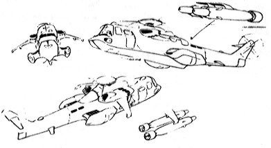 SPECIAL EQUIPMENT: comes standard with military radio W/scrambler, satellite uplink, full visual suite, damage control, Fire extinguisher, auto-pilot, navigation systems, cybernetic linkage, military radar with terrain following, radar detector, laser communicator,chaff and flaredispensers, ECM, ECCM, (able to carry either a passenger pod holding 22 men, a cargo pod, or if need be it can transport cargo on a slung load.)