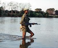 a rebel carrying an old M-16 (Possibly an M-16/M-204 combo) or an