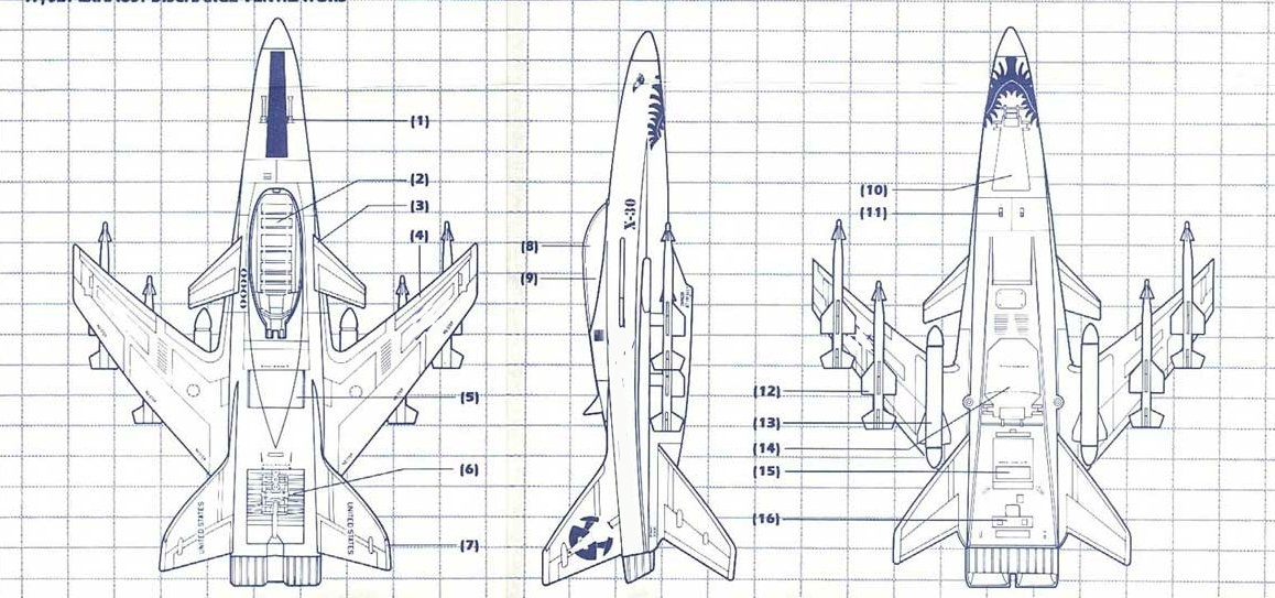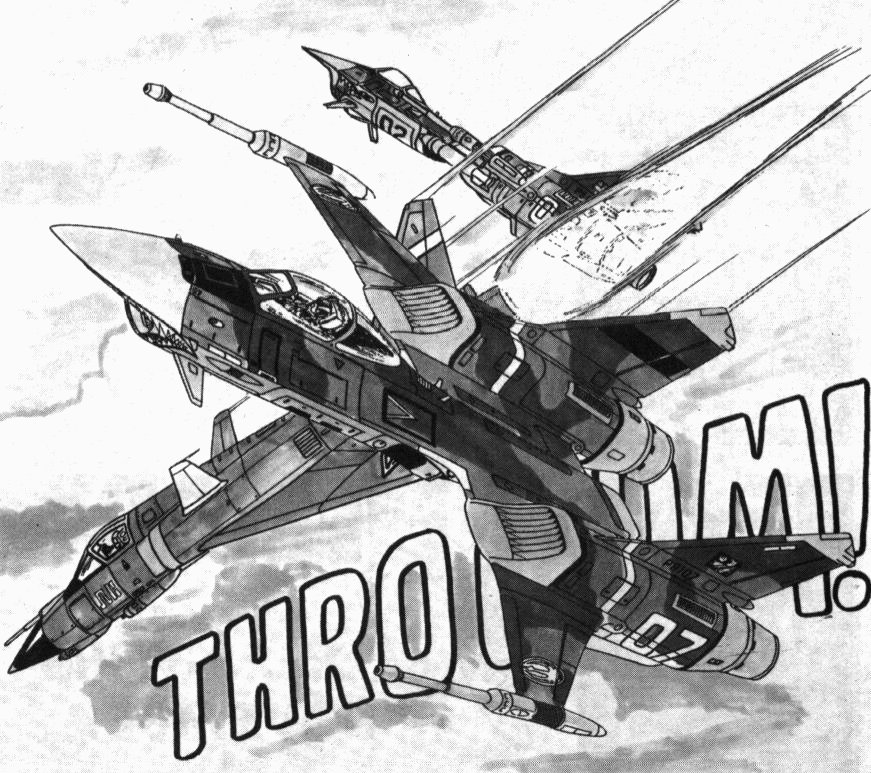SPECIAL EQUIPMENT: military radio W/scrambler, ECM, ECCM, ejection seats, damage control, chaff, Fire extinguisher, laser detector, 12 hours life support, auto-pilot, navigation systems, military radar with target ID and look down, radar detector, cybernetic linkage, laser communicator, chaff and flare dispenser, environment control, single use disposable booster (allows the aircraft to travel at speeds up to 17,000 mph to allow it to be able to keep up with launching spacecraft.)