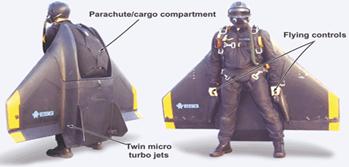 A true personal jetpack that allows fro incredible feats of acrobatics and increases the range of a jumper tremendously. In normal use, the user will jump from a plane, or suitably high structure, then once terminal velocity has been reached he will activate the jets, allowing for speeds of up to 300 miles per hour, and a range of 100 miles. The jet pack can achieve lift-off, however the thrust required to do so wil diminish the range to 50 miles. Landing must be done via parachute, but can be accomplished within 50 meters of the ground by an expert.